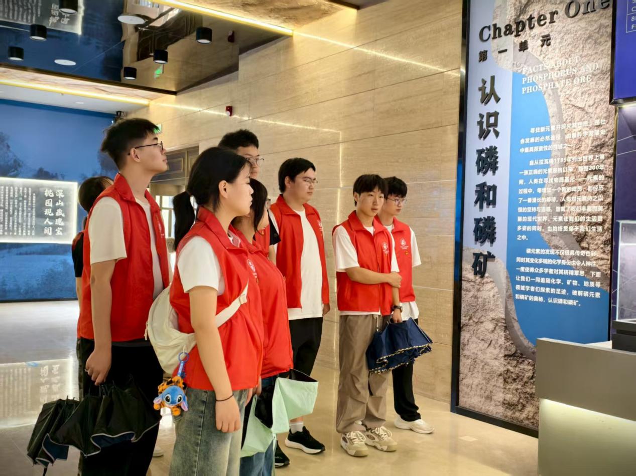 随后,实践团前往尧治河中国磷矿博物馆,全面了解尧治河村因磷矿起步、转型发展的历程。围绕 “绿色矿山建设 —— 人与自然和谐共生”,成员们学习了磷矿分布、成因及尧治河的先进经验,涵盖开发原则、经营管理、生态实践、文化构建等方面,为专业学习与践行绿色发展理念筑牢基础。