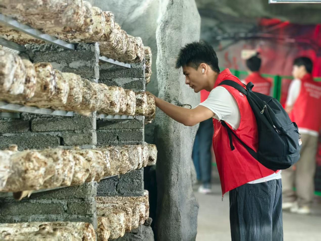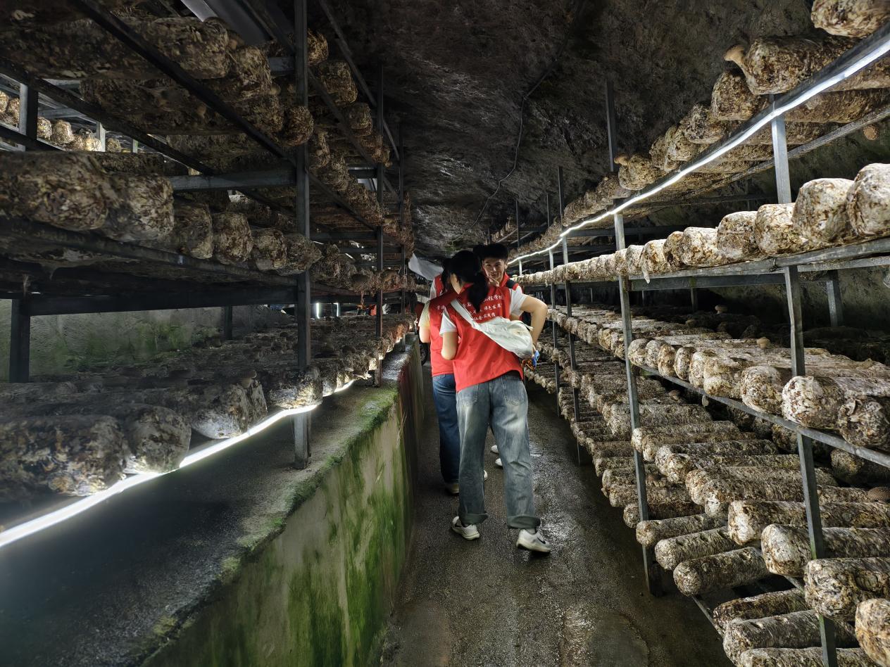 次日,为探寻 “绿色发展” 实践与 “矿洞经济” 模式,实践团来到食用菌矿洞。这里利用废弃矿洞,开展变废为宝的绿色实践。矿洞恒温恒湿,为食用菌生长创造了优良条件,一排排菌棒上,鲜嫩的食用菌蓬勃生长。负责人介绍,矿洞种菌每年能为村里增收几十万,吸引了不少年轻人返乡就业。