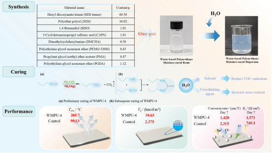 研究显示,单纯的阴离子或非离子改性无法显著提升树脂的亲水性。通过混合改性方法制备的优选配方包含一种水性聚氨酯潮固化树脂(WMPU - 4),最终获得数均分子量(Mn)为10,929、重均分子量(Mw)为21,804、分散度(Đ)为2.00,以及亲水性(粒径95.05 nm,多分散指数(PDI)为0.3271)的最优树脂。与单一改性方法相比,这种双重改性方案在加水后显著延长了活化期。Zeta电位测量结果表明,磺酸盐改性树脂在水中会经历熟化过程,其绝对Zeta电位呈逐渐增加趋势。尽管存在游离异氰酸酯基(NCO),该树脂仍能在水中稳定分散。衰减全反射 - 傅里叶变换红外光谱(ATR - FTIR)分析揭示了薄膜的固化机制,小角X射线散射(SAXS)显示存在显著的微相分离,其晶面间距(d - spacing)为12.60 nm,低于对照组的10.60 nm。扫描电子显微镜(SEM)和原子力显微镜(AFM)证实WMPU - 4表面更为光滑。热重分析(TGA)表明WMPU - 4的5%热失重温度(T5%)为207.5℃,优于对照组的99.13℃。差示扫描量热法(DSC)测试结果显示,WMPU - 4的熔化焓(ΔHf)为33.95 J/g,远高于对照组的7.426 J/g。动态热机械分析(DMA)表明WMPU - 4在40℃时的交联密度(Ve)为10.63 kmol/m³,显著高于对照组。电化学测试表明WMPU - 4具有出色的耐腐蚀性(第7天的腐蚀速率为1428 μm/Y),低于对照组的2315 μm/Y。该新型树脂可广泛应用于木材涂料、工业涂料、胶粘剂、地板等对环保安全有严格要求的领域,具备重要的产业化价值。