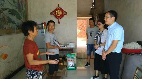 随后,在驻村扶贫队袁队长、队员胡光明老师及村干部陪同下,大家冒着酷暑高温走村入户,挨个走访结对贫困户。两学院老师通过深入交谈,详细了解了结对帮扶对象的家庭现状、主要经济来源、目前急需解决的困难等第一手资料。根据不同贫困户面临的问题,大家分析目前市场热门产业以及帮扶对象家庭的实际条件和资源,对家庭今后创收提出了合理化建议。在走访中,两学院还为贫困户送去米、油、牛奶等生活物资。