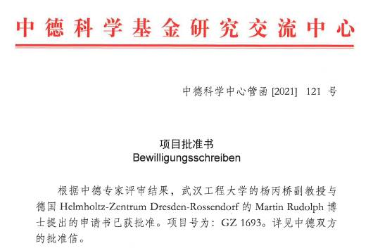 本网讯(通讯员杨丙桥)近日,国家自然科学基金委员会中德科学中心公布了2021年中德合作项目的资助名单,我院杨丙桥副教授与德国亥姆霍兹德累斯顿罗森多夫研究中心Rudolph Martin博士联合申报的“德国优秀青年基金项目(长期)”正式获批立项,项目获批经费44万,项目编号GZ1693,该项目研究周期三年。