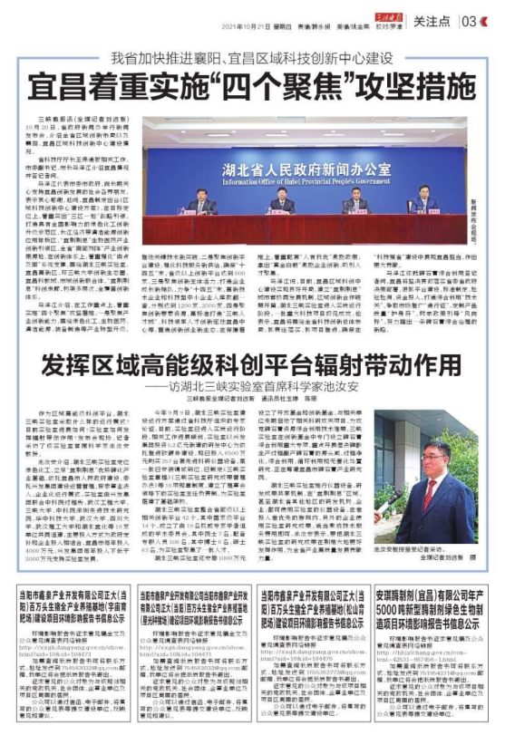 10月20日,《湖北日报》刊发题为《三峡实验室瞄准磷石膏综合利用世界性难题》的报道,《科技日报》刊发《湖北三峡实验室致力解决磷石膏综合利用世界难题》的报道,《中国科学报-科学网》报道了《湖北宜昌搭建科研平台破解磷石膏综合利用难题》。10月21日,《三峡晚报》刊发题为《发挥区域高能级科创平台辐射带动作用》通讯报道。10月25日,《中国化工报》刊发题为《定位绿色化工!三峡实验室瞄准磷石膏综合利用世界性难题》通讯报道。