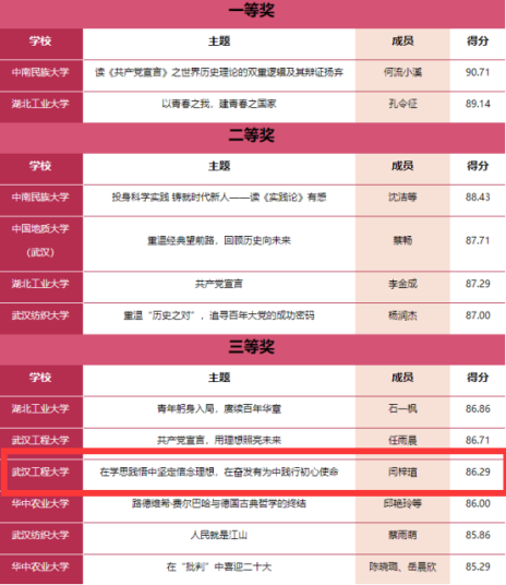 和湖北工业大学等6所高校的12个团队参加。经过激烈角逐,我院学子闫梓萱的作品《在学思践悟中坚定信念理想,在奋发有为中践行初心使命》荣获三等奖。围绕“喜迎党的二十大,一起向未来”主题,从解读马克思主义经典文献入手,讲述国家的百年新征程,展现出了当代中国青年的青春活力,也充分展现了共产党人的奋斗精神,发出了“请党放心,强国有我”的时代强音。