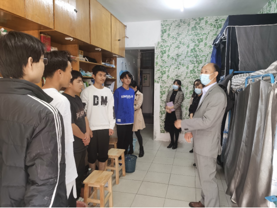 调研结束后,喻发全到研究生工作室、本科生实验室和学生5号宿舍楼了解、检查学生网课情况和学生实际需求。在本科生宿舍里,他详细了解并解答同学们线上学习和生活中遇到的问题与疑惑,为学生讲解国家和省市防疫政策,特别强调线上学习要自律,讲方法、讲效率。
