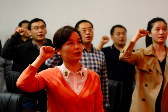 会上,学院与会全体教职工和党员举行了庄严的宣誓仪式,由学院副院长周芳带领全体教师重温入职誓词,学院党务干事王耀眉带领全体党员教师重温入党誓词。