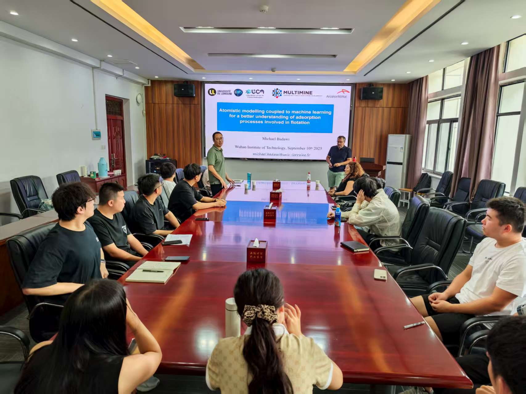 李洪强教授主持。Badawi教授以“基于机器学习与分子动力学相结合的浮选过程研究”为题,深入介绍了人工智能与分子模拟在矿物浮选机理研究中的前沿进展,强调了多学科融合对提升资源利用效率的重要意义;Quintana教授则以“将二维材料融入环保应用的若干策略”为题,结合自身研究成果,系统阐释了二维材料在环境治理与绿色能源领域的应用潜力,展示了新材料为应对环境挑战提供的新路径。两位教授的精彩报告内容丰富、视野开阔,为师生带来一场学术盛宴。