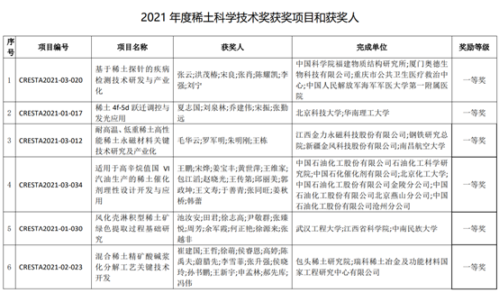 2021年度稀土科学技术奖共表彰19项,其中一等奖7项,二等奖12项。该奖项是由中国稀土学会和中国稀土行业协会联合设立、国家科学技术奖励工作办公室社会奖励处备案,旨在奖励在稀土科学技术领域做出突出贡献的单位和个人,调动稀土相关领域科技工作者的积极性和创造性,推动我国稀土科学技术的创新发展。