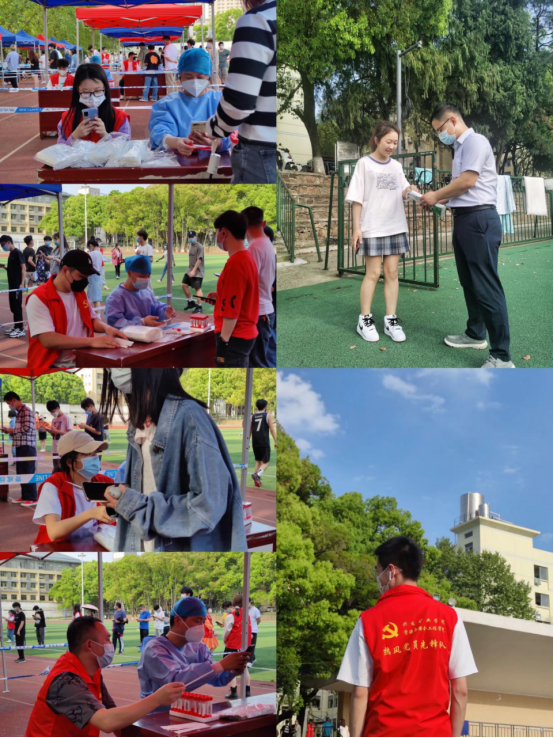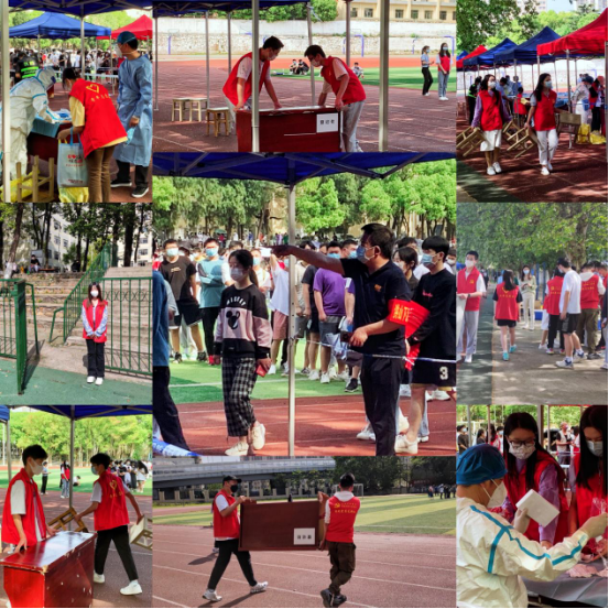 学院志愿服务者们配合医护人员要求,参与到现场布置、秩序维持、发放棉签、信息登记等各项工作中。