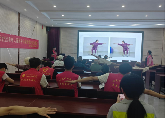 活动现场,志愿服务队以音乐放松操活跃氛围,通过PPT讲解+现场演示的方式系统讲解跌倒风险因素及预防技巧,重点演示曲肘缓冲着地冲击、侧转卸力分散压力、撑膝跪立稳定重心” 等 “防跌倒三式” 防护技能,并借助医学模型解析骨骼承压原理。通过手把手指导与情景模拟,帮助老年朋友直观掌握科学防护要领。