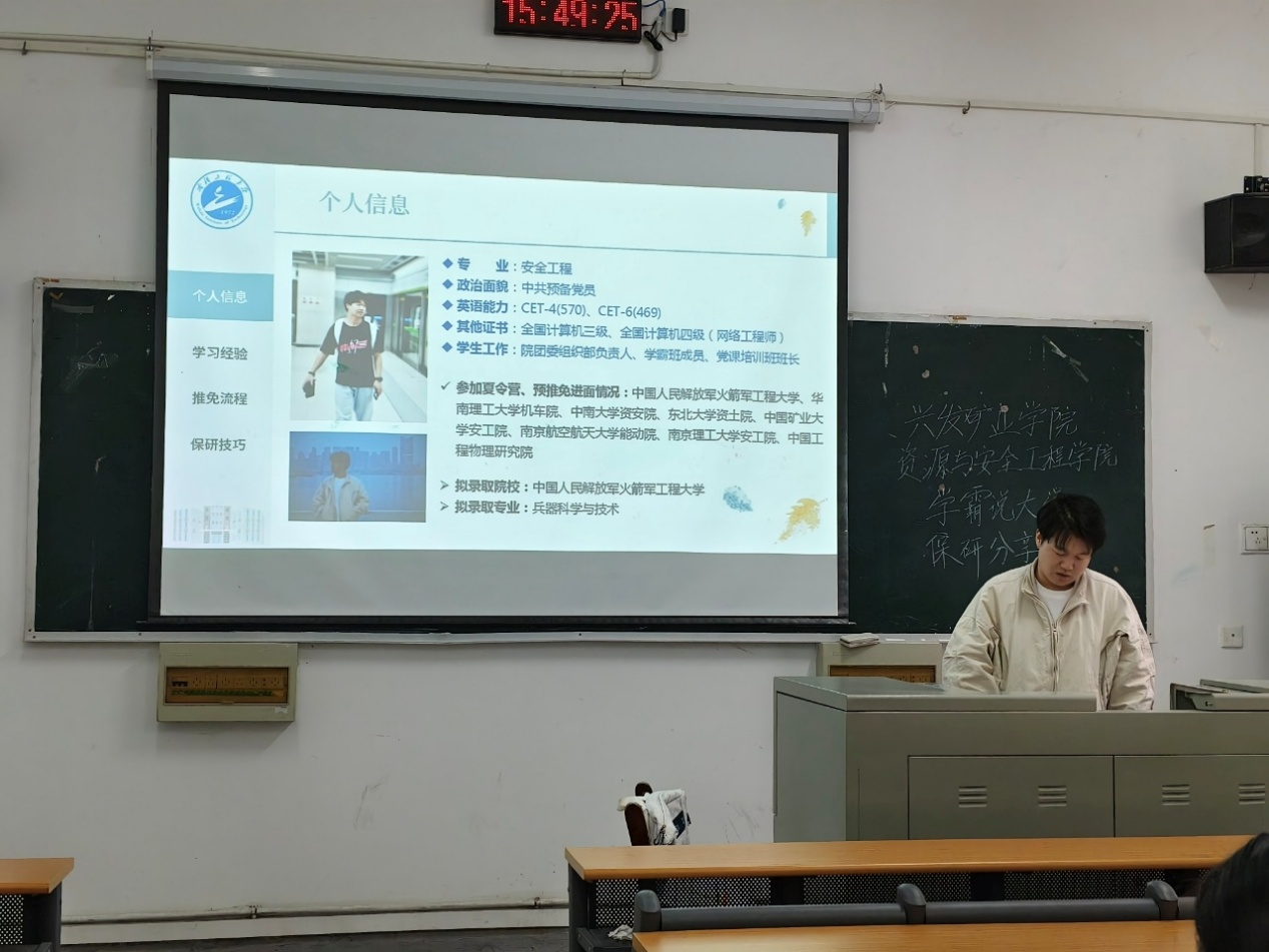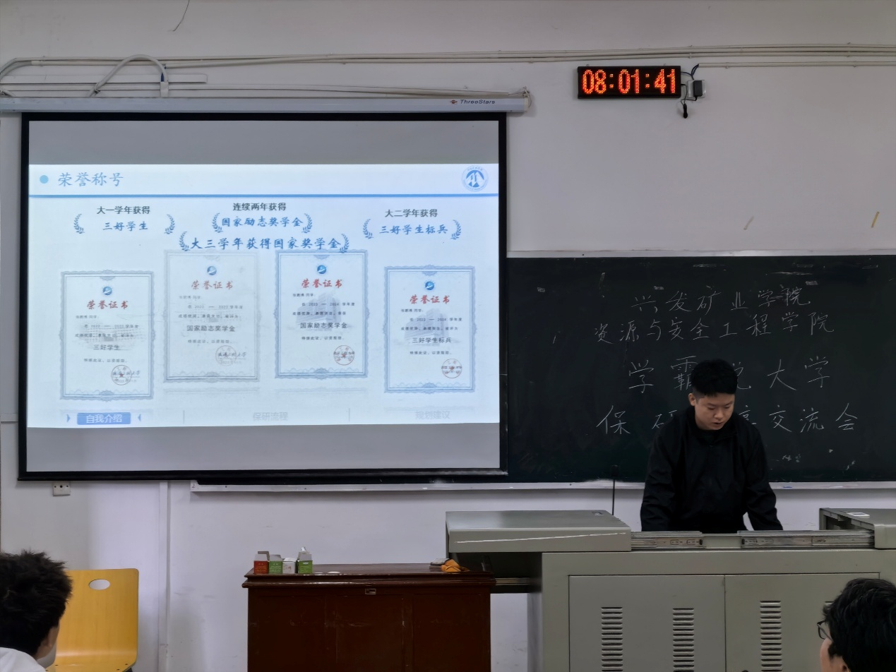 矿物加工工程01班由张鹏博学长聚焦“如何在大学四年写出精彩的简历”展开分享,自信从容地解答新生疑惑:“夏令营”、“预推免”、“九推”的含义、如何在正确的时间节点做好保研相关工作等。