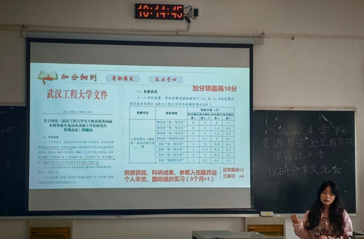 采矿专业保研学生代表崔淼森在2025级采矿工程01班详细讲解绩点提升技巧,强调合理规划学业、提升科研能力、掌握核心软件技能,并建议广泛投递、积极参加夏令营,为保研成功奠定基础。