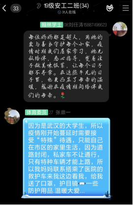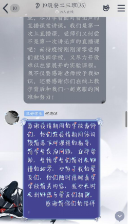 班会教育引导活动是感恩主题教育月的活动之一。会上,为了增强我院学生的感恩意识,增进学生与父母的感情,使他们更加懂得知恩,班级同学在团支书或者班长的引导和感恩教育月氛围的渲染之下表达感恩。他们向一线的工作人员致敬;他们向一直坚守在生产线的工人问好;他们向勤于网课直播的老师们表达感谢;他们向疫情发生以来日夜担心自己的父母表达感激。