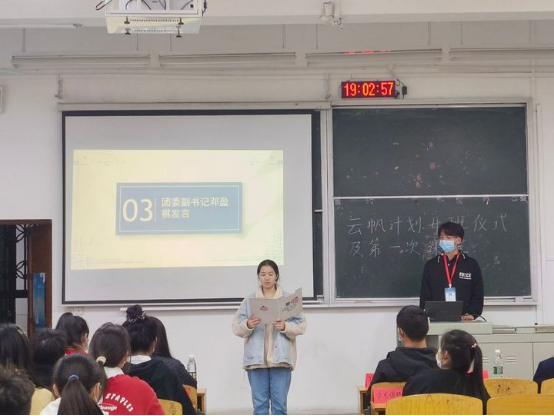 院团委副书记(学生)邓盈祺介绍了本次培训班的意义和作用,阐述了“云帆计划”中的“云帆”之意,“云帆”取自李白的诗《行路难》中“直挂云帆济沧海”,借由诗句中那不畏前路险阻,积极乐观的处事态度鼓励全体学生干部,号召全体成员在此次培训班中学到有用的知识和技能,提升自己的能力。