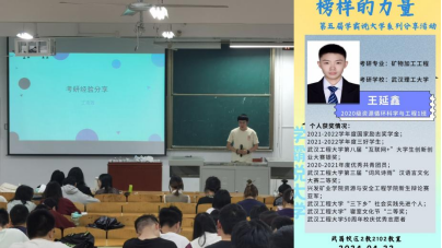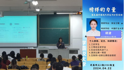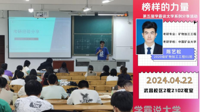 第五届“学霸说大学”系列分享会之考研经验分享会在武昌校区W2102教室顺利举办。本次分享会邀请了2020级矿物加工工程专业陈艺松、2020级资源循环科学与工程专业的梁处芳、王延鑫和2020级安全工程专业的胡波担任分享人。全体2021级学生参加,此次分享会由学院毕业生辅导员郑浩然主持。