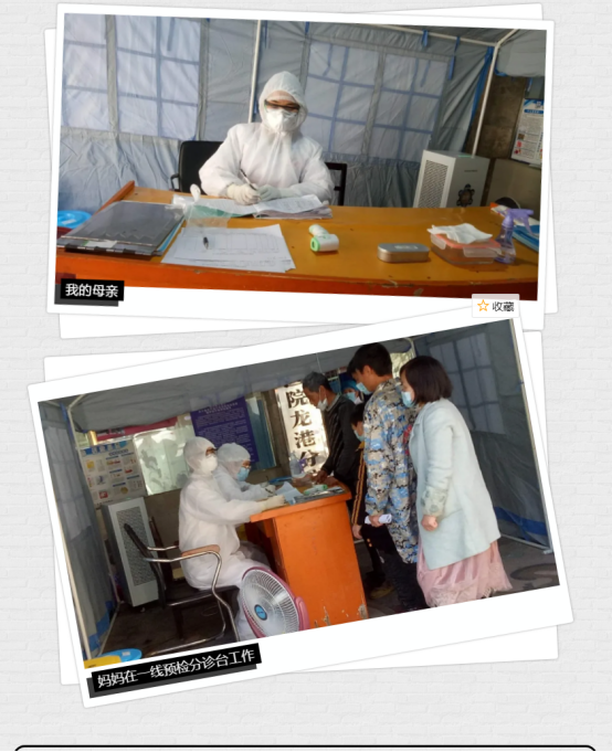 一线工作总是充满着艰辛与危险,她在发热门诊负责预检分诊工作和隔离消毒病人,这是院内防控的第一关。特殊时期,前来就诊的患者个个都是神疑心虑,作为进门的第一道防线,她不仅要耐心检测体温询问接触史,还要指导他们作好防护。看似简单的工作,背后却需要强大的坚守力与忍耐心。因为要与病人密切接触,穿上厚重的防护衣对她来说既是保护又是枷锁。一天都不去卫生间、不喝水、由于饮食和作息的不规律给身体带来不适……这些付出都是为了更好的服务病人。在此隔离治疗病人期间,母亲更是只能通过视频来表达她对子女的愧疚和思念,作为一名医护工作者,她牺牲了陪伴家人的时间,冒着生命危险,不顾自己年岁大小,守住防疫一线,不让病毒越过一步。