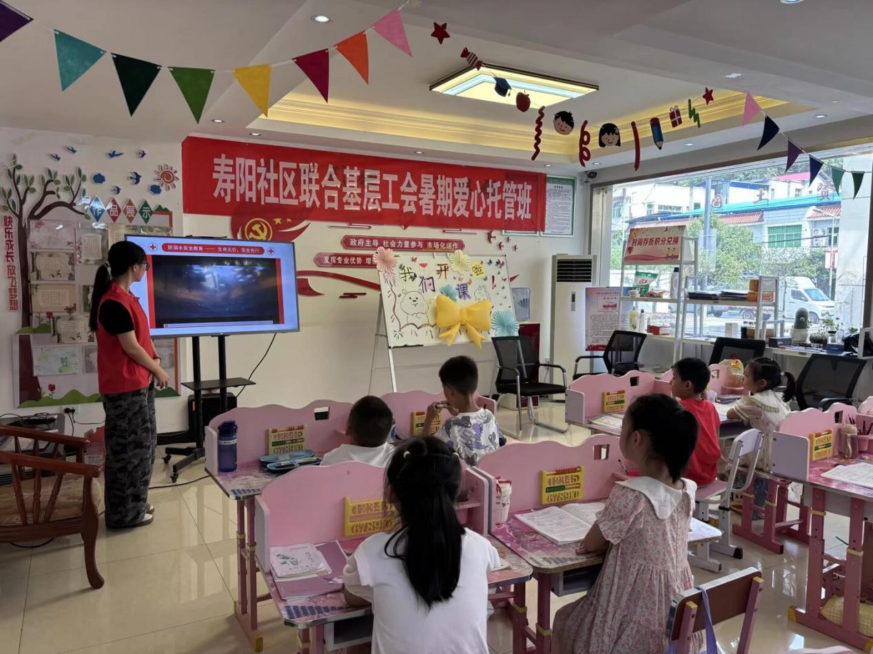 第二日下午,“点亮安全灯” 社会实践团前往寿阳社区,联合基层工会暑假爱心托管班开展安全知识宣讲活动。成员们深知安全知识对儿童成长的重要性,围绕防溺水、交通、消防、网络安全四个方面进行详细讲解。
