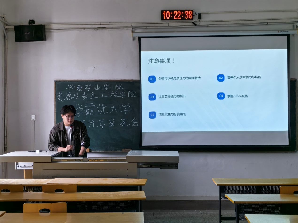 矿物加工工程01班由张鹏博学长聚焦“如何在大学四年写出精彩的简历”展开分享,自信从容地解答新生疑惑:“夏令营”、“预推免”、“九推”的含义、如何在正确的时间节点做好保研相关工作等。