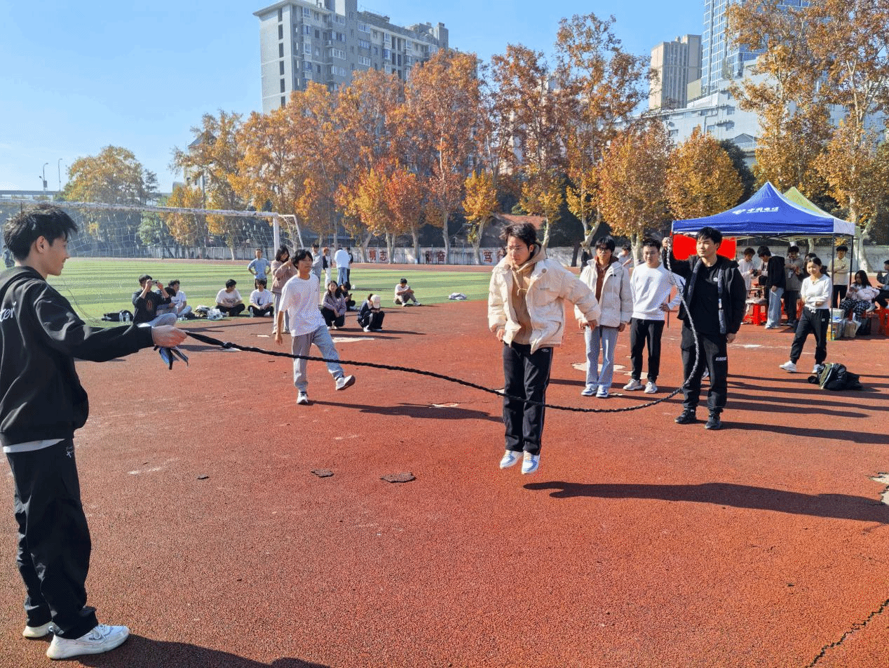 武昌校区田径场举办“妙趣乘风起,携手共青春”主题团日活动。本次活动包含“趣味拔河”“八字跳绳”“趣味三子棋”“一圈到底”四个内容。学院团委指导老师耿胡锐、学生团委副书记王艺樨、主席团成员、学院全体团学骨干、2025级新生参加了本次活动。